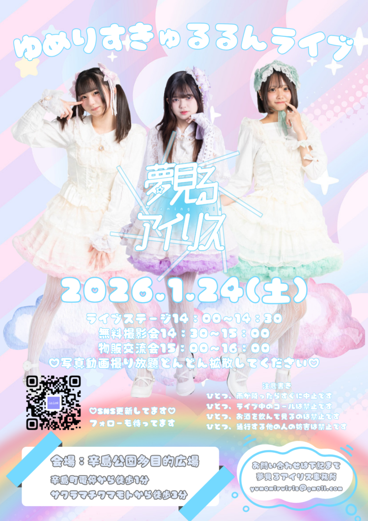 ゆめりすきゅるるんライブ イベント 2025.12.26 イベント詳細 このイベントは 24 1月 2026 から 24 1月 2026 まで開催しています。 次回の開催は 2026年1月24日 です。 会場: 花畑広場 カテゴリ: イベント 開催日: 2026年1月24日 公式HP イベント概要 夢見るアイリスの定期路上ライブです。 ・ライブパフォーマンス ・無料撮影会 ・物販交流会 X Instagram TikTok YouTube 開催日程 2026年1月24日(土) 開催時間 14:00~17:00 開催場所 辛島公園多目的広場 入場料 無料 お問い合わせ先 まっけん写真事務所:090-4988-2374 公式HP